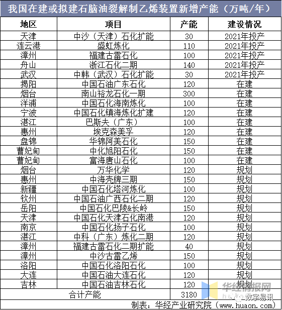 在乙烯盈利能力普遍稳健、供需缺口较大的情况下,新建炼化一体化项目均配套大乙烯项目。随着一批炼化项目配套乙烯装置投产,加之部分扩能改造项目,预计2021–2024年,我国将新增石脑油裂解乙烯产能约1670万吨/年,另有规划中的乙烯产能约1510万吨/年,合计新增产能约3180万吨/年。