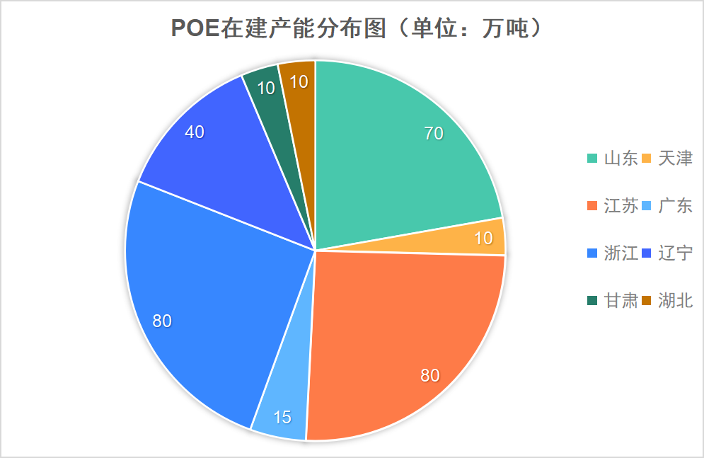 依照统计来看,POE的在建项目主要分布在东部沿海,江苏、浙江、山东以及辽宁地区,规划产能已经突破300万吨。